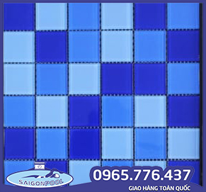 Gạch mosaic thường dùng cho hồ bơi. Gạch được thiết kế màu xanh dương truyền thống. Thiết kế hài hòa cân đối màu sắc xanh đậm, nhạt xanh biển. Gạch mosaic có tính phản quang, bề mặt sáng mịn tạo nên không gian hồ bơi có màu xanh biển tự nhiên.
